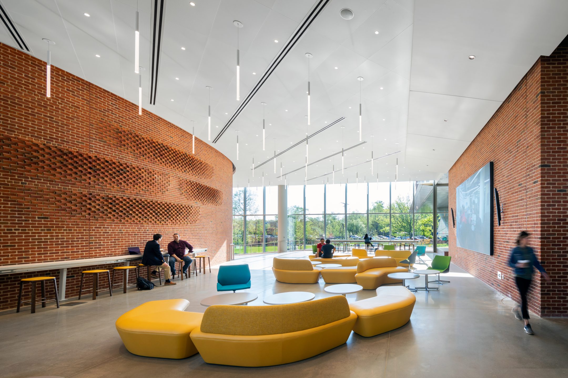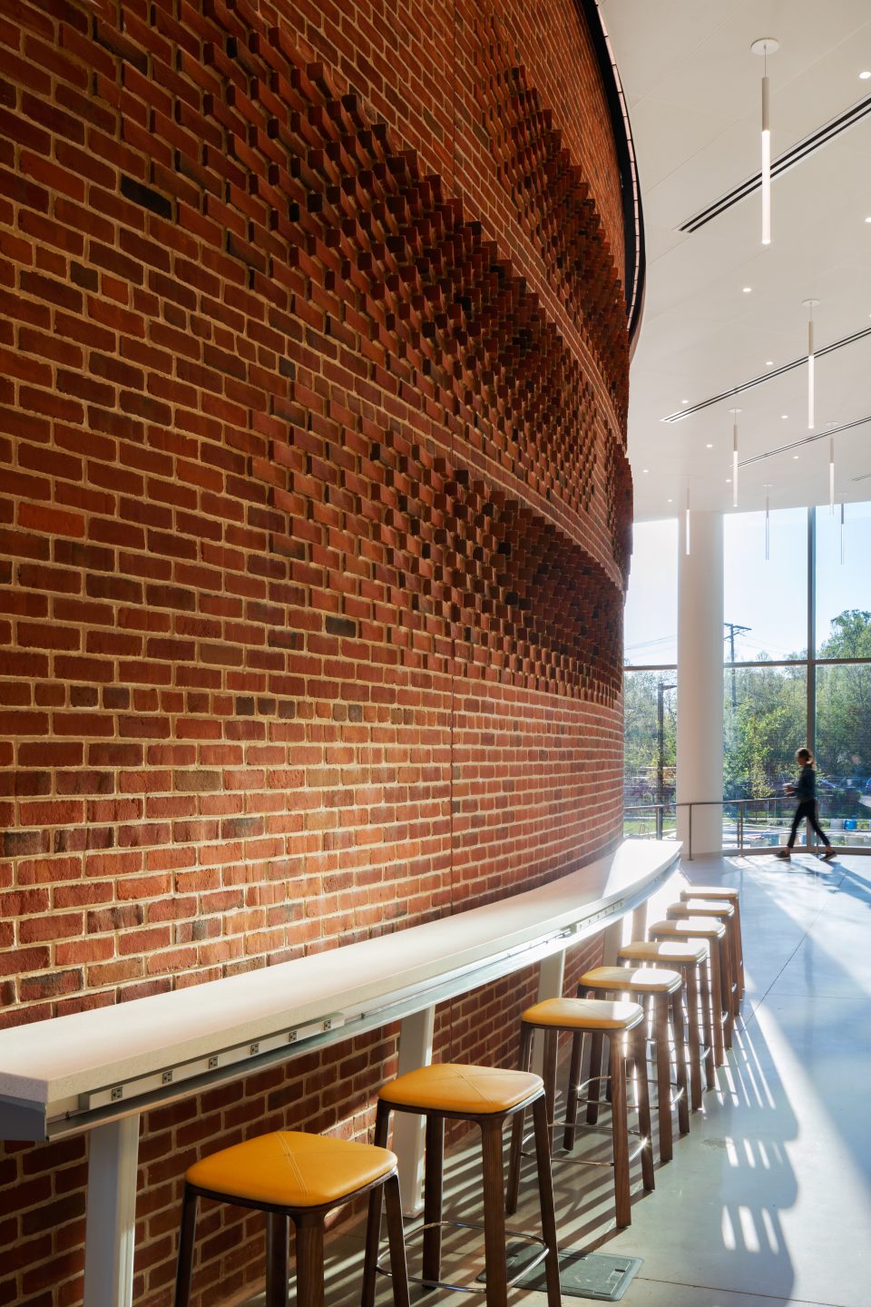 Situated at the University of Maryland campus, the Brendan Iribe Center is a six-story instructional and research facility, encompassing 215,600 SF. This cutting-edge center houses intricate, specialized laboratories that support endeavors in augmented reality, artificial intelligence, robotics, and programming, while also serving as the home of the Antonov Auditorium. The building incorporates elements and features that resonate with the university's Neo-Georgian legacy, showcasing brick finishes on both the auditorium and landscape walls. Within the Computer Science and Engineer Center, an interior wall showcases a mesmerizing arrangement of bricks, creating an illusion of fluid, dynamic motion. The Brendan Iribe Center has won numerous awards, including a 2021 Silver Award in the Educational (Higher Education) category of the Brick Industry Association’s “Brick in Architecture Awards.” For this project, Potomac Valley Brick supplied a University Blend and a Handmade brick from Cushwa Brick.