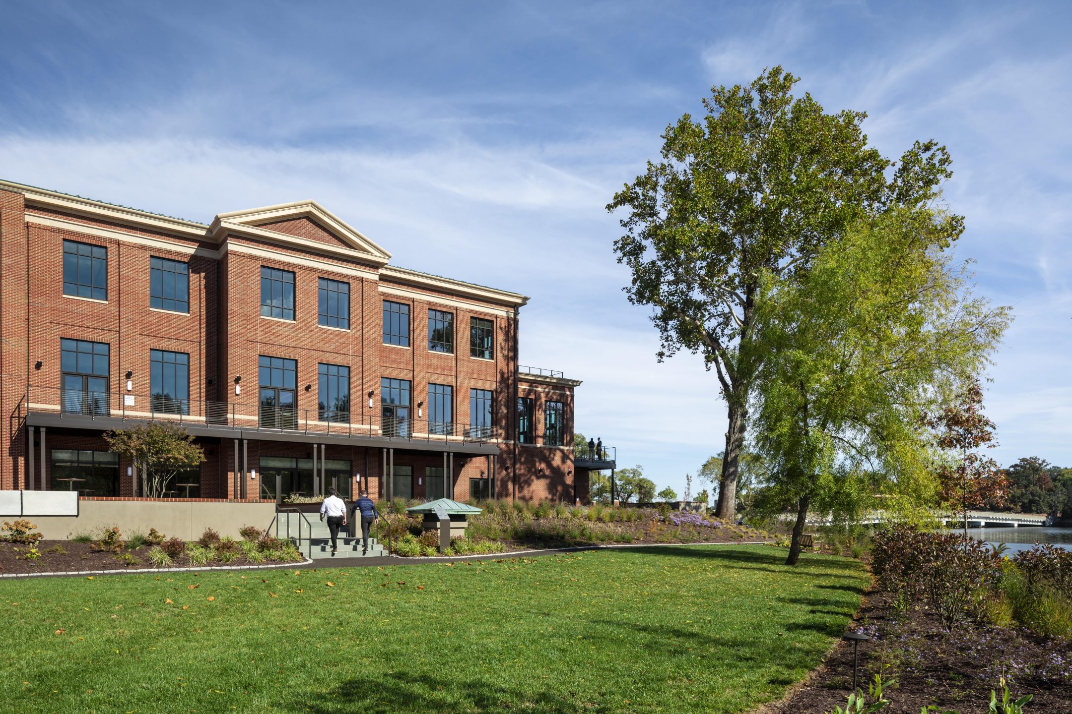 The Fluegel Alumni Center is a premier event space serving the Naval Academy community, alumni, and local organizations. Situated on King George Street along the picturesque College Creek, the stately brick building overlooks downtown Annapolis, a gateway to the esteemed Naval Academy campus. Fluegel Alumni Center is a beacon across generations, safeguarding a rich legacy of traditions and ideals. Architect Perkins Eastman’s strategic planning process prioritized functionality and tradition, guaranteeing a vibrant space that pays homage to heritage. The design not only enriches the wide range of activities and functions within the center but also caters to the requirements of a dynamic alumni workforce and community while paying homage to those who served in the U.S. Navy and the Marine Corps. For this project, Potomac Valley Brick supplied brick from General Shale Watsontown and an engineered support system from Tabs Wall Systems LLC. 📷 Photography by Andrew Rugge. Copyright Perkins Eastman.